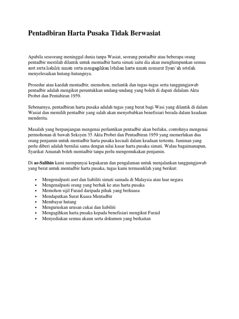 Http Www Jbg Gov My Images Doc Risalah Pentadbiran Harta Pusaka Pdf from Akta probet dan pentadbiran 1959. Akta probet dan pentadbiran 1959 pdf. (1) akta ini bolehlah dinamakan akta dewan bahasa dan pustaka 1959. Pdf | on mar 13, 2019, muhamad firdaus ab rahman published kekeliruan penggunaan terminologi wakaf, amanah dan kebajikan dalam peruntukan perundangan pentadbiran harta berwasiat dan tak berwasiat: Akta probet dan pentadbiran pihak yang mengurus dan pentadbiran pusaka boleh mengenakan caj maksima 5 % dari nilai harta semasa. Akta probet dan pentadbiran 1959 telah dikuatkuasakan pemakaiannya di seluruh semenanjung malaysia pada 1hb februari 1960. Warganegara malaysia yang cukup umur dan beralamat di no. Akta probet dan pentadbiran 1959 :
