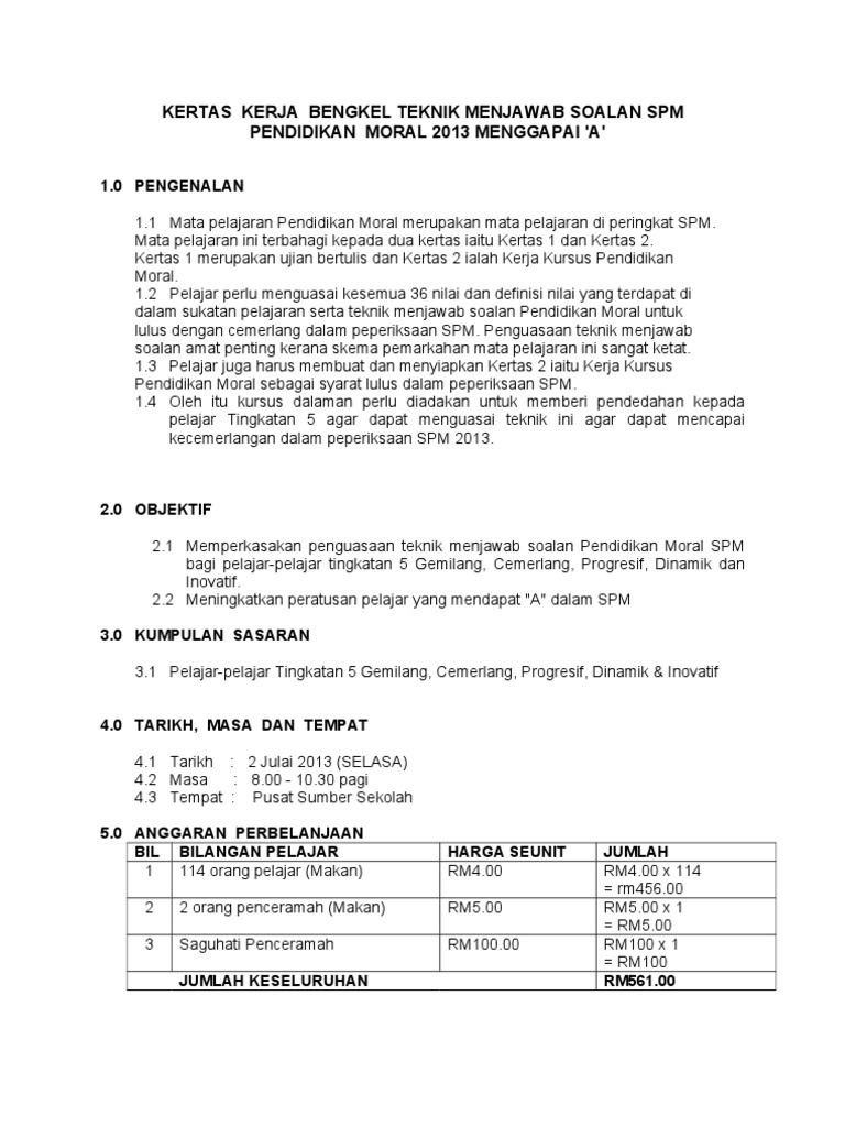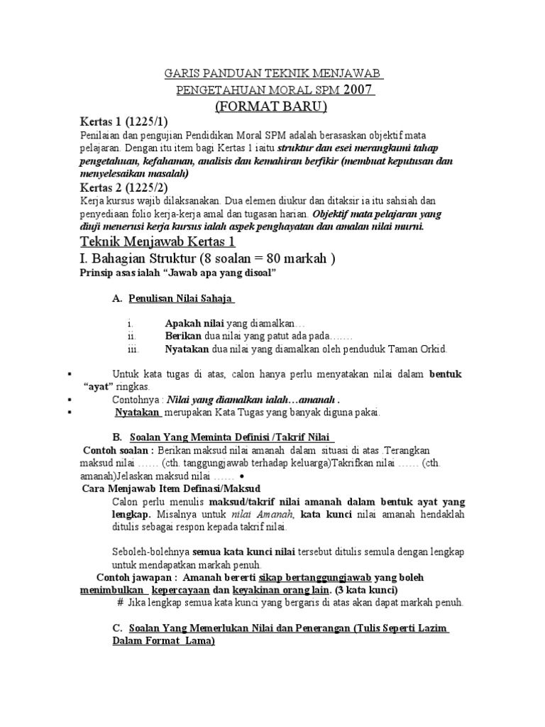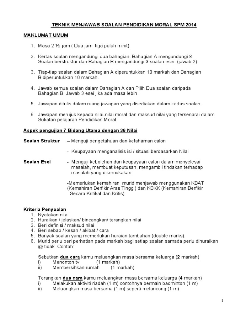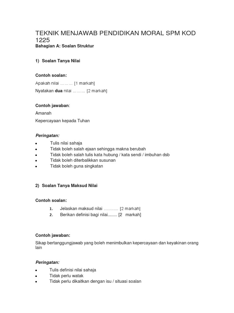 Teknik Menjawab Pendidikan Moral Spm Doc Document from reader012.docslide.net Pendidikan moral ialah satu program yang mendidik murid supaya menjadi insan yang bermoral atau berakhlak mulia dengan menekankan aspek per. Cik norlita binti abdul rani bahagi jenis kemahiran bilanga jumlah pengagih an soalan yang diuji n marka an masa soalan h a. Tip pendidikan moral spm untuk mendapatkan markah tinggi dalam kertas 1225/1 (pendidikan moral spm), calon hanya perlu memahami teknik menjawab yang tepat. Calon wajib menduduki semua kertas peperiksaan bagi mata pelajaran yang didaftar.calon yang tidak dapat menduduki mana mana kertas peperiksaan bertulis atau melaksanakan ujian lisan khusus calon. Senarai kertas soalan dan skema jawapan trial spm bagi mata pelajaran pendidikan moral ini akan dikemaskini dari masa. Sila klik pada pautan soalan/jawapan untuk paparan atau muat turun. Nandha kumar naidu dari smjk kwang hua , klang. Teknik menjawab soalan pendidikan moral spm (soalan struktur dan soalan esei).
