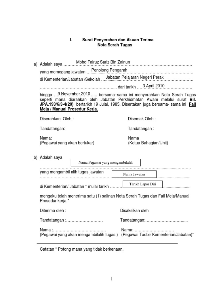 Nota Serah Tugas Pss from reader020.staticloud.net Hal tersebut yang menjadikan contoh surat serah terima barang selalu dibutuhkan dan dicari. Contoh surat serah terima pekerjaan karena cuti. Surat tugas biasanya akan dikeluarkan ketika ada salah satu karyawan dari perusahaan, lembaga pemerintahan atau instansi yang lainnya untuk menugaskan pekerjaan diluar. Biasanya penyerahan jabatan disusun dalam acara berbentuk upacara. Berita acara serah terima pekerjaan pekerjaan pasang crane. Kedudukan terakhir tugas tugas yang belum selesai. Inilah rekomendasi tentang contoh surat serah terima dokumen sederhana doc. 09 s/d 11 juni 2015 tempat :